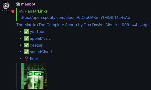 A screenshot of the result. Showing that "The Matrix (The Complete Score)", which was linked as a Spotify link, can be also found on YouTube, AppleMusic, Deezer and SoundCloud but not on Tidal.